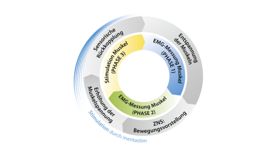 The “mental movement” increases the electrical potential of the muscle, which is measured by mentastim as an electromyogram (EMG). Thereafter the muscle will be electrically stimulated to return a positive feedback to the brain about the planned execution of the movement.