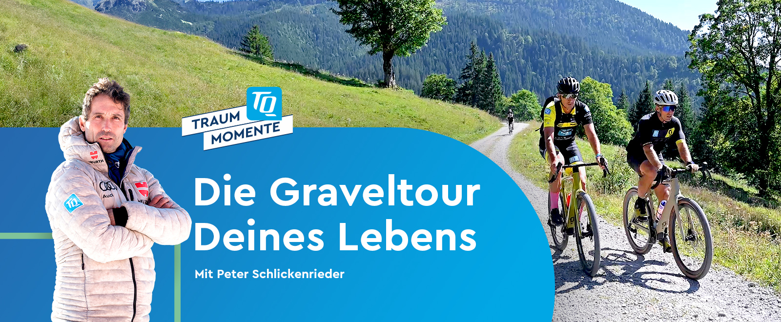 Die Graveltour Deines Lebens mit Peter SchlickenriederErlebe bei der Graveltour Deines Lebens ein unvergessliches Abenteuer in der Natur. Gemeinsam mit Peter Schlickenrieder, dem Olympiamedaillengewinner und Goldtrainer im Langlauf und Deiner Begleitung hast Du die Möglichkeit das neueste Scott E-Gravelbike zu testen. Integriert im E-Bike befindet sich natürlich auch unser neues TQ-HPR60 Drive System - das leiseste, leichteste und kleinste System seiner Klasse. Die Tour führt Dich und Deine Begleitung über einzigartige Trails in der wunderschönen Voralpenregion.